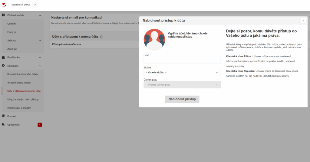 Udělení přístupu do Zboží.cz je úzce spojené s účtem v Skliku, protože produktová správa kampaní na Zboží.cz probíhá právě v Skliku. Samotná práva se ale upravují v na doméně klient.seznam.cz, kde běžně spravujete vaše platby za inzerci.